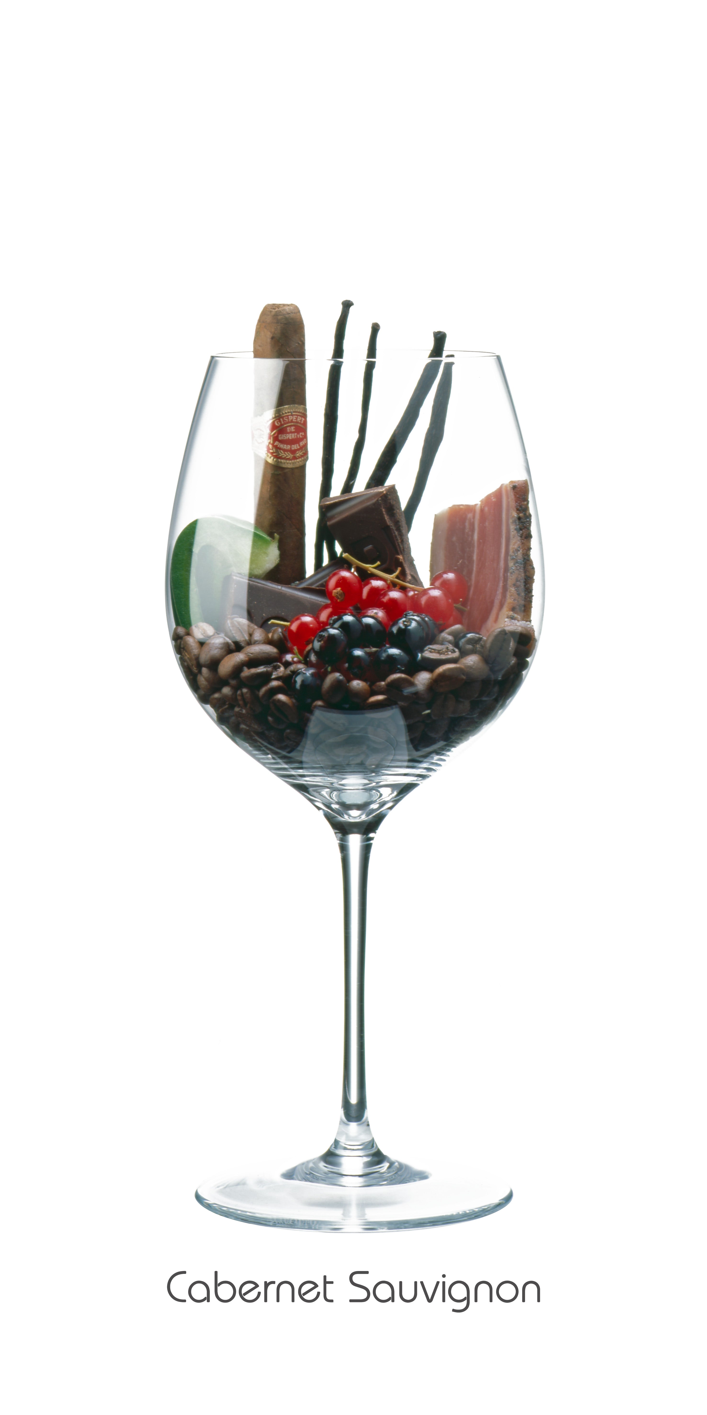 Weinaromen der Rebsorte Cabernet Sauvignon im Glas: Rote Johannisbeere, Grüne Paprika, Vanillestange, Tabak, Bitterschokolade, Kaffee, Speck - fotografiert von Armin Faber.