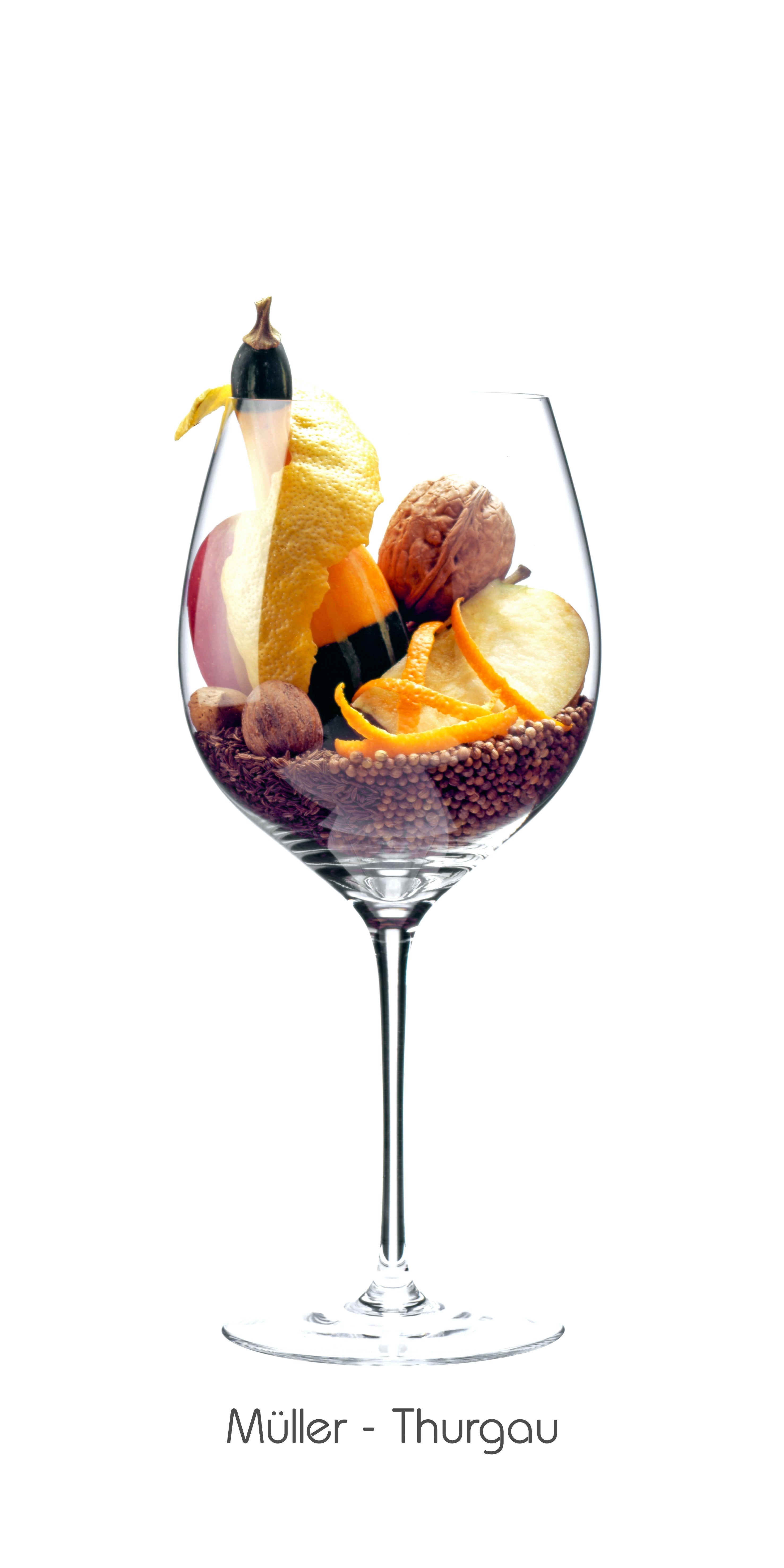 Weinaromen der Rebsorte Müller-Thurgau im Glas: Rote Johannisbeere, Kirsche, Heidelbeere, Himbeere, Zeder, Minze, Gras, Vanille - fotografiert von Armin Faber.