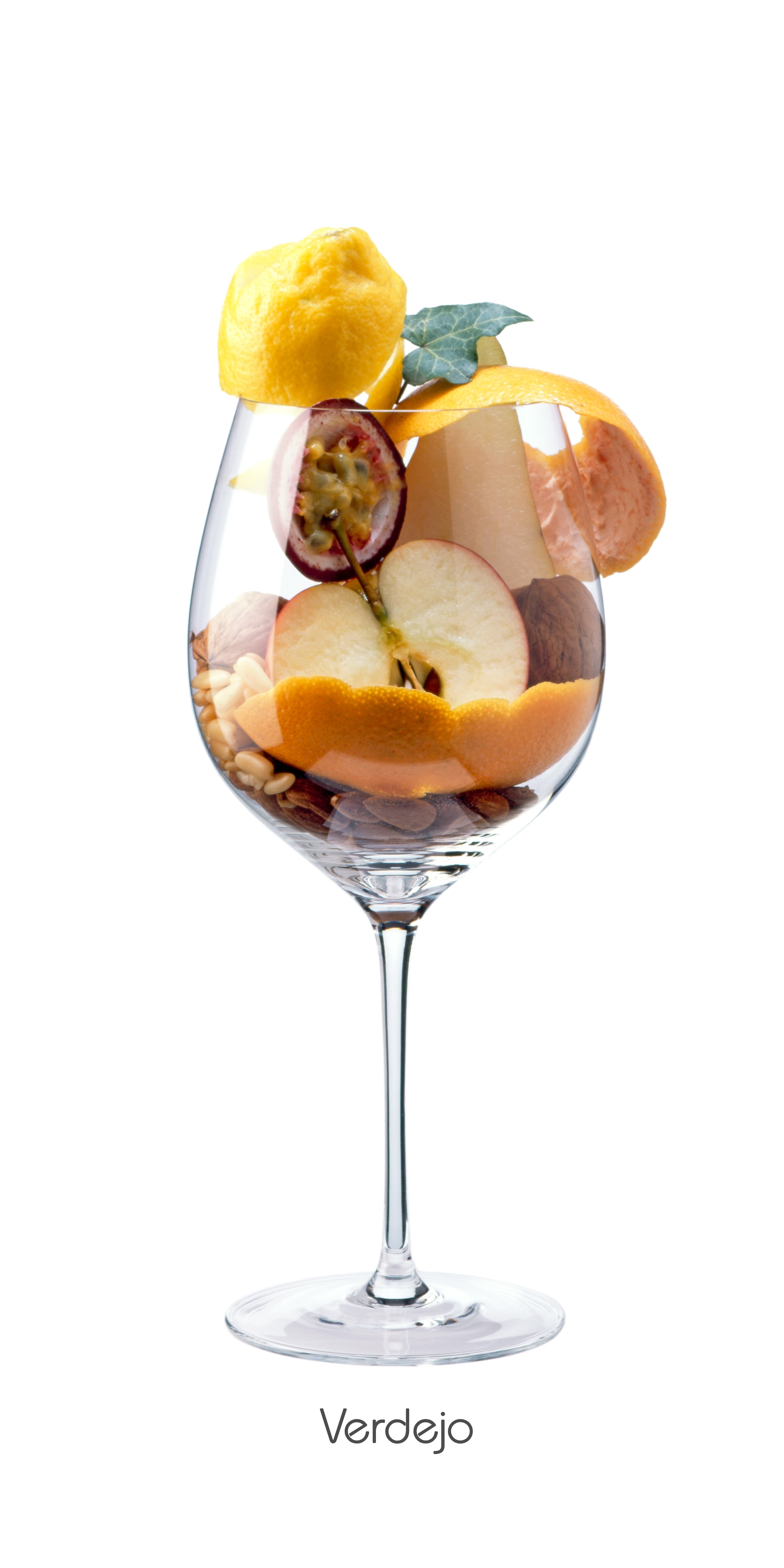 Weinaromen der Rebsorte Verdejo im Glas: Apfel, Birne, Grapefruit (Schale), Passionsfrucht, Zitrone (Schale), Walnuss, Mandel (bitter), Efeu, Pinienkern - fotografiert von Armin Faber.