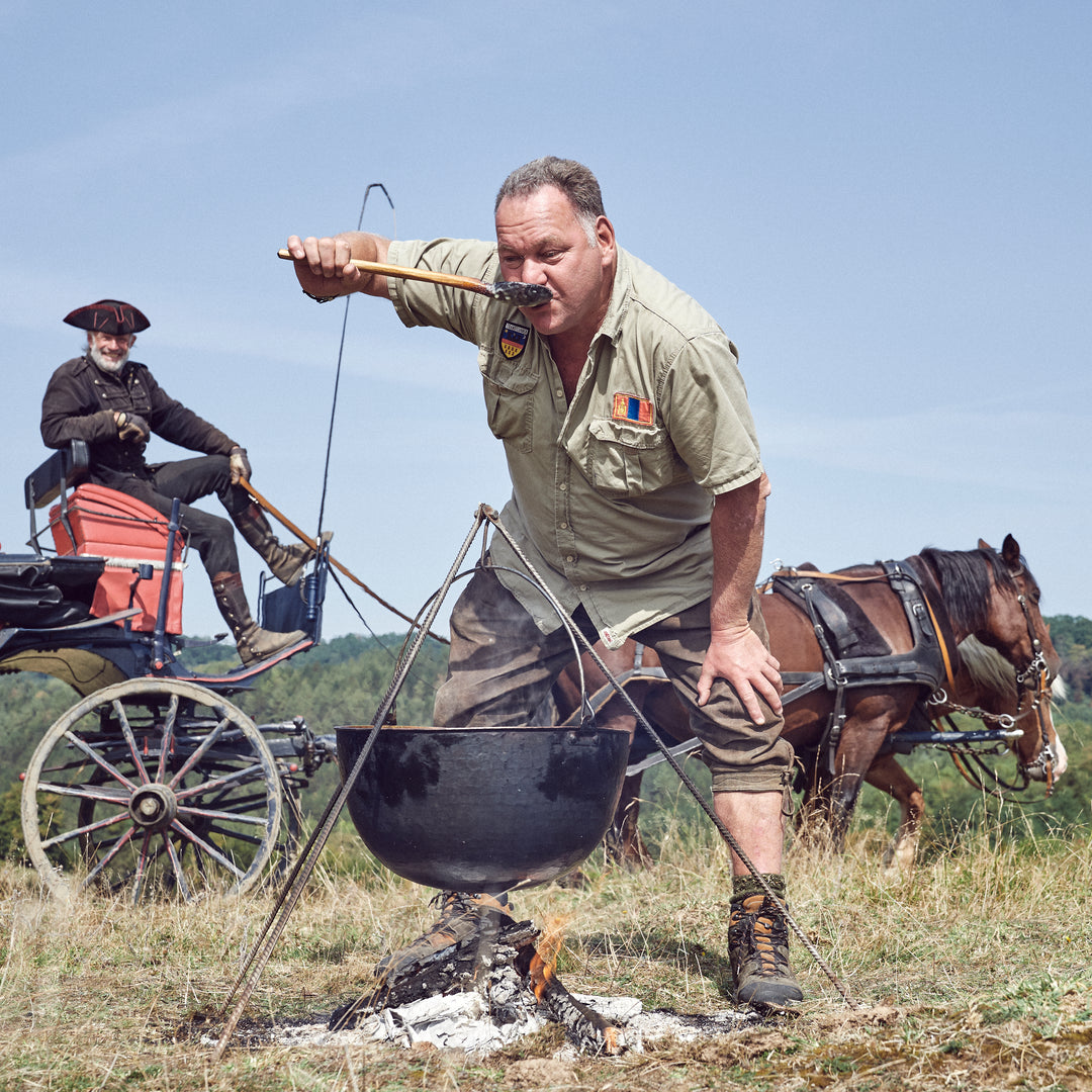 Wir leben im Wesentlichen von den Gaben der Natur - zubereitet über offenem Feuer. Der Wald gibt uns Wildfleisch wie Elch, Weißwedelhirsch, Tauben und Enten, aber auch Pilze, Blaubeeren und Preiselbeeren. Der See gibt uns Fisch wie Hecht, Forellen, Barsche, Felchen und Flusskrebse. Fleisch und Gemüse kaufen wir von den Bauern auf dem Markt.