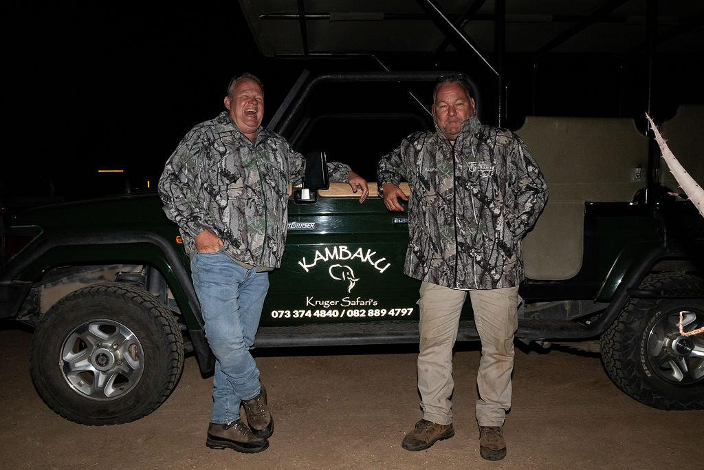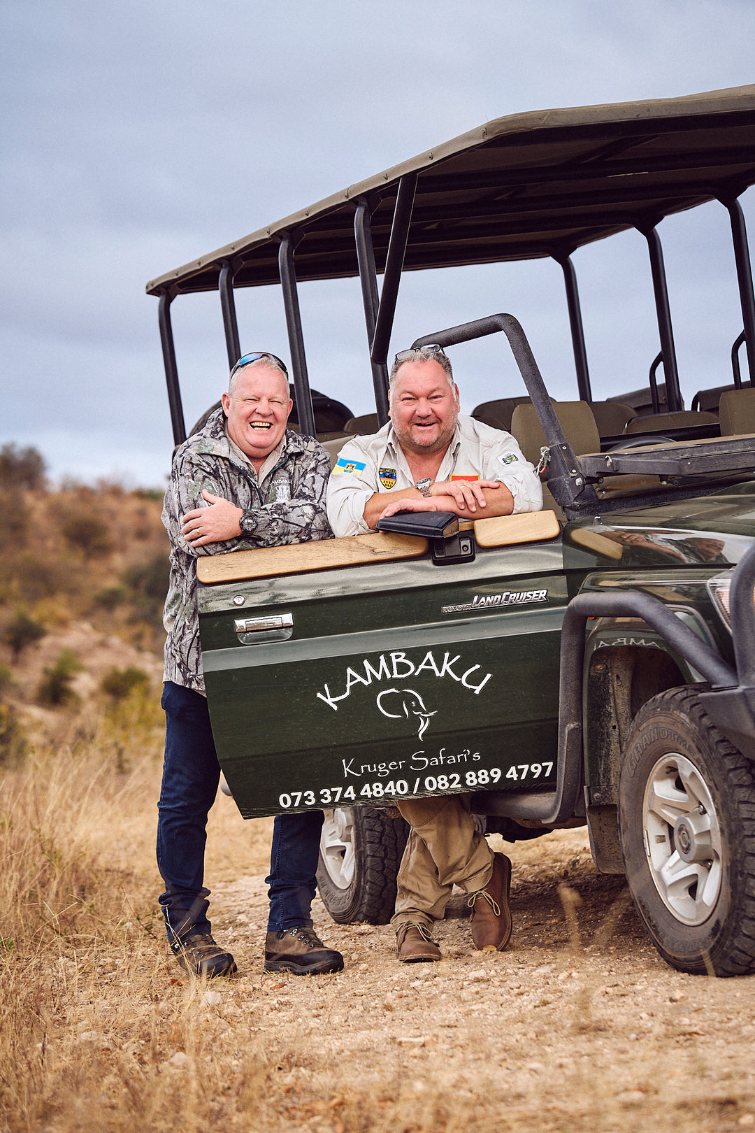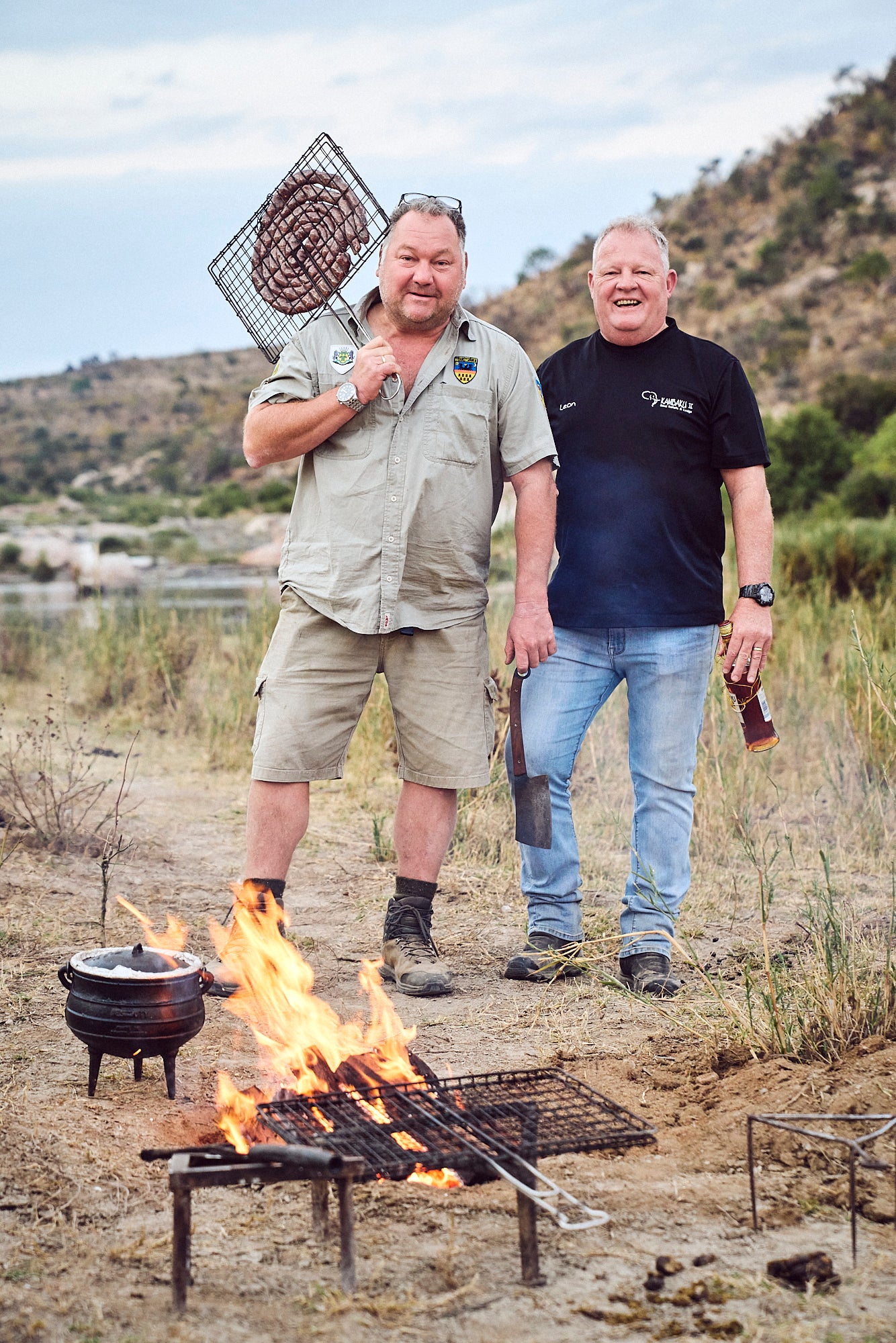 Leon & Roland, "soulmates" im Umgang mit der Natur und Inszenierung südafrikansicher Lebensart. Leon ist Inhaber der Kambaku-Lodge und Rolands Partner. Mit Energie und Bodenhaftung transportieren die beiden Ihre Passion für Fauna, Flora, die Geschichte Südafrikas und authentische Kulinarik im Busch - zu Wasser auf dem Olifants River, zu Land in offenen Jeeps und in der Luft mit dem Heli oder Heißluftballon.