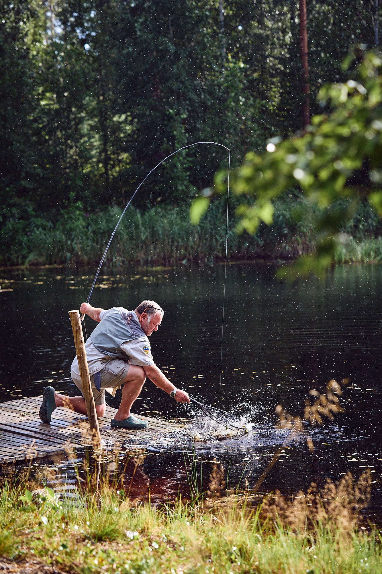 Gefischt wird mit der Handangel (Blinker, Wobbler, Spinner, Jigger oder Fliege) direkt vor der Tür vom Ufer oder von eigenen Ruder- und Motorbooten (4 PS Aussenborder) zum Schleppangeln und ausbringen traditioneller Barsch- und Flusskrebs-Reusen. Jede unserer Hütten hat einen eigenen Anlegesteg, zwei Boote und ein Sonnendeck.