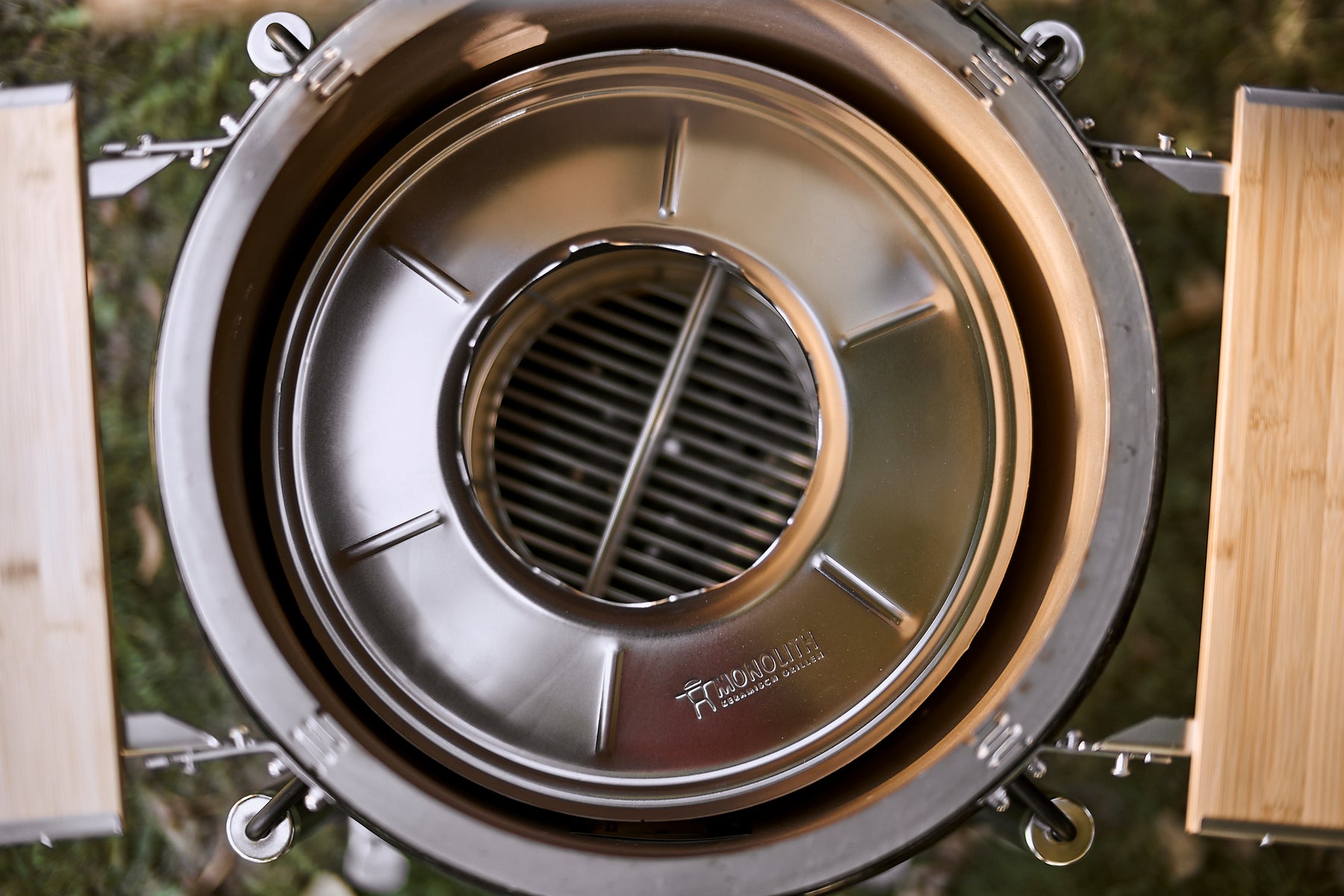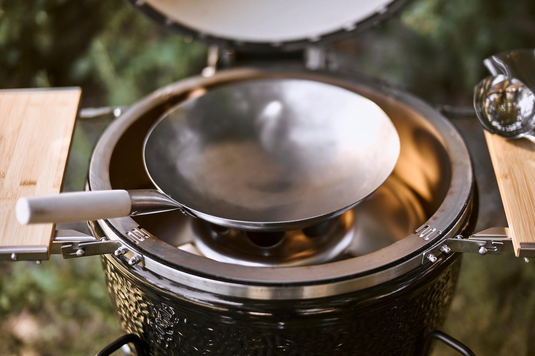 Der Wokhalter aus Edelstahl wird auf den Feuerring gesetzt. Durch die spezielle Bauform wird die Hitze zentriert, da für perfekte Ergebnisse im Wok eine hohe Hitze erforderlich ist.
